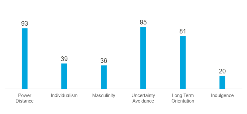 Social pchyhologist G. Hofstede’s cultural dimentions can provide an insight into Russian cultural values (in percentage). The following table (from Hofstede Insights 2023) illustrates the results:
